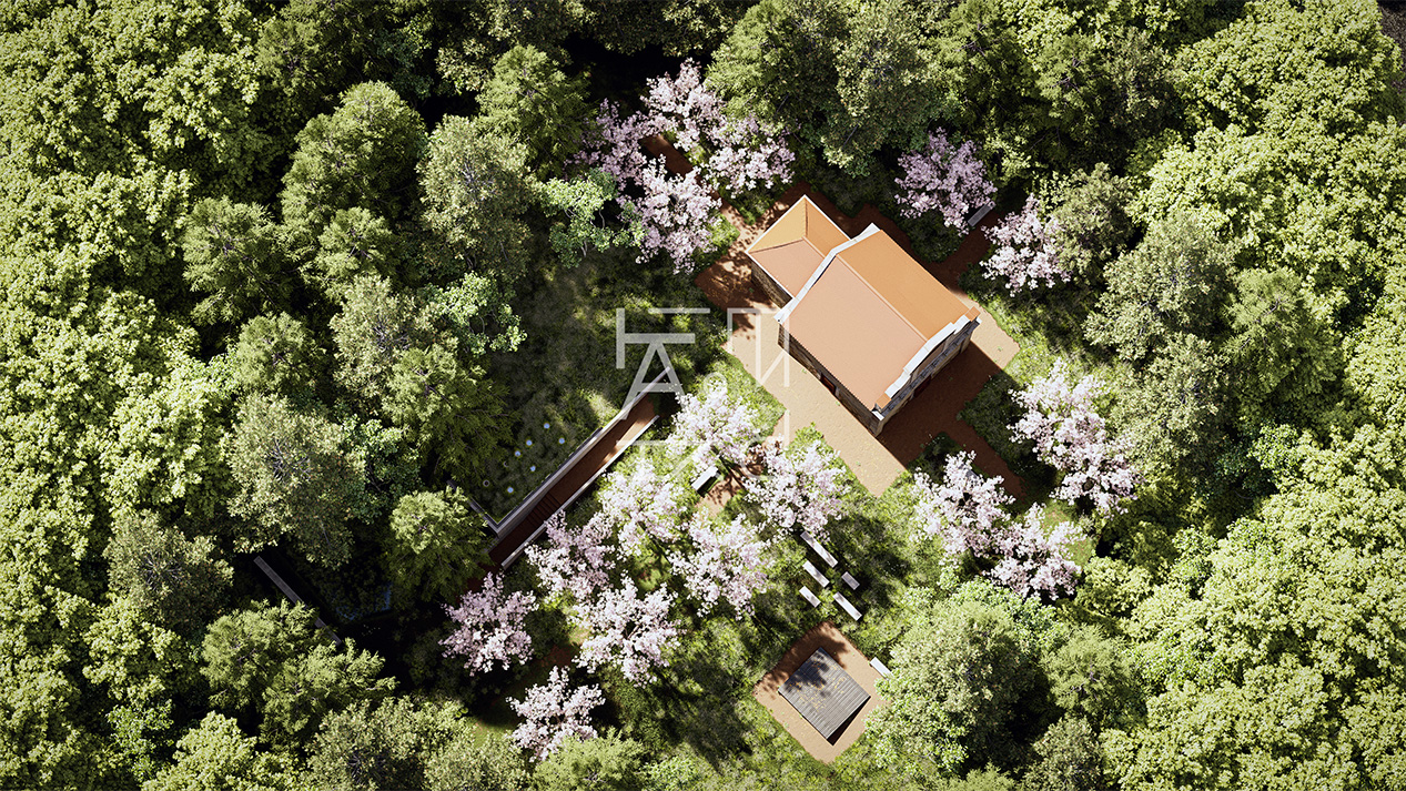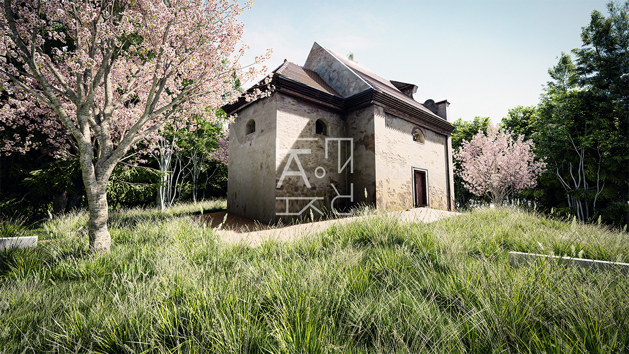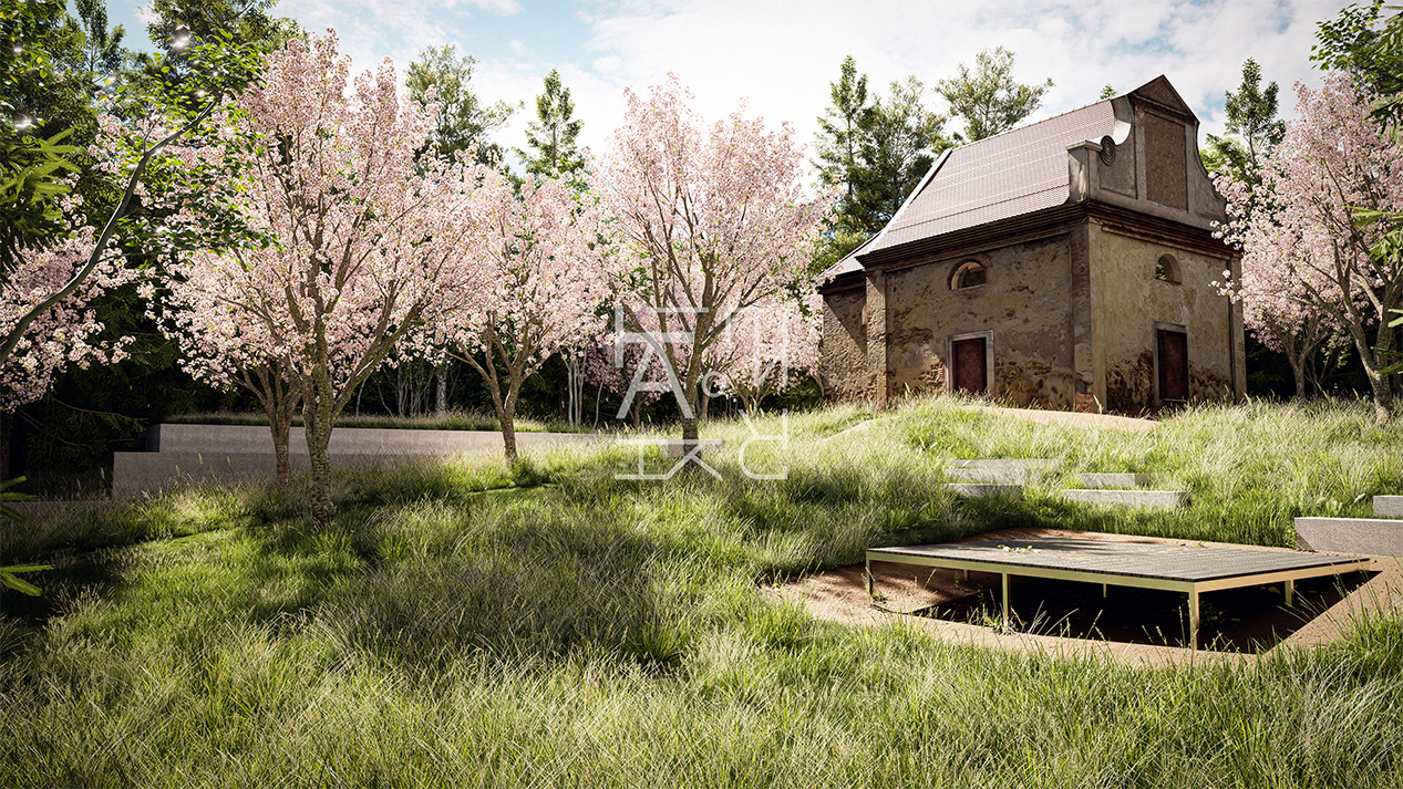Symetriu a krížovú osovosť dopĺňajú po bokoch chodníkov aleje z ovocných stromov. Druh a forma zasadenia stromov charakterizuje odkaz na barokový urbanizmus, ktorý hľadal súlad s formovaním krajiny a prírody. Plody stromov ako pokrm pre pocestných sú spojením telesného a duchovného rozmeru človeka, ktorý hľadá obživu tela aj ducha. Pôvodné dreviny sú doplnené na pozemku okrasnými trávami, ktoré naväzujú na koreňovú čističku s jazierkom.