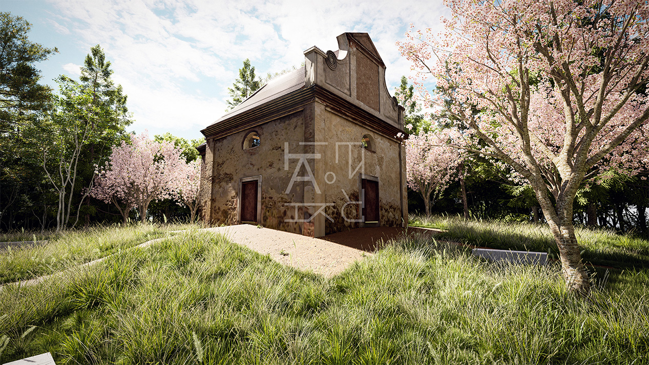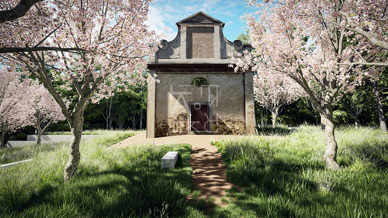 Nadväznosť na symetriu konštrukcie pokračuje v podobe úpravy okolia kaplnky s dôrazom na svetové strany vo forme spevnených plôch. Táto nadväznosť má význam otvorenosti, pozvania, ale aj presahu formy a jej významu do súčasnej krajiny.