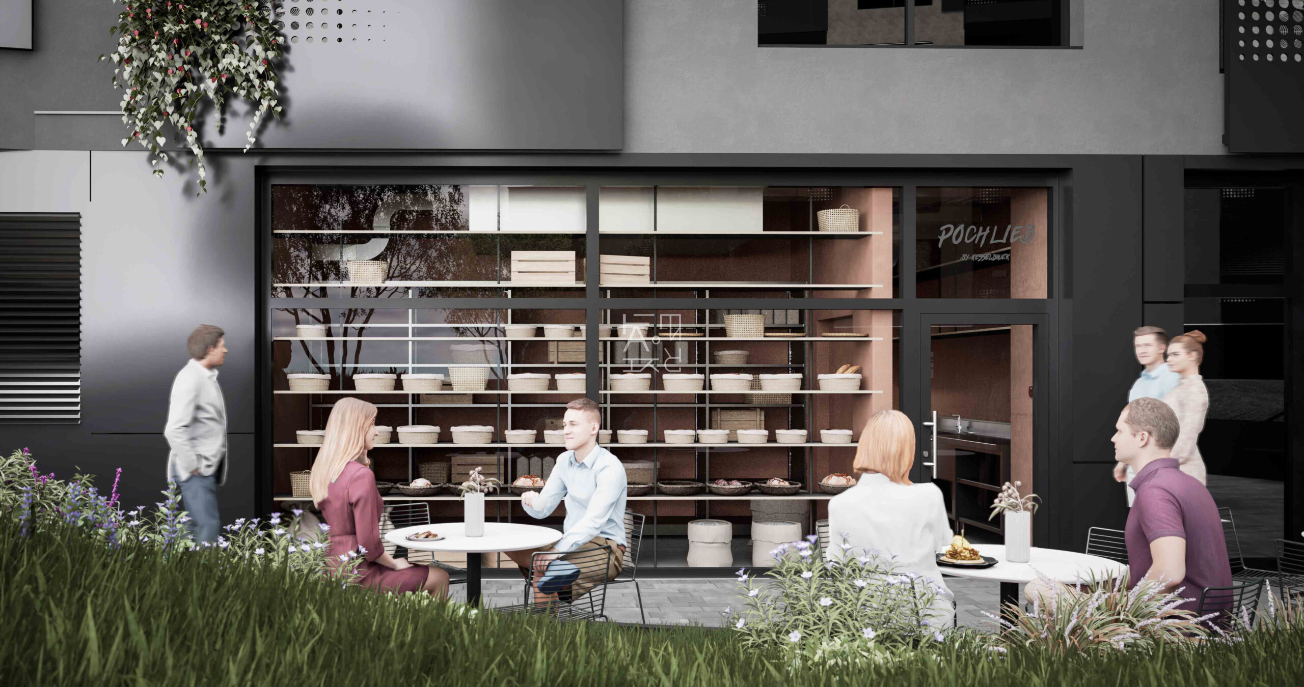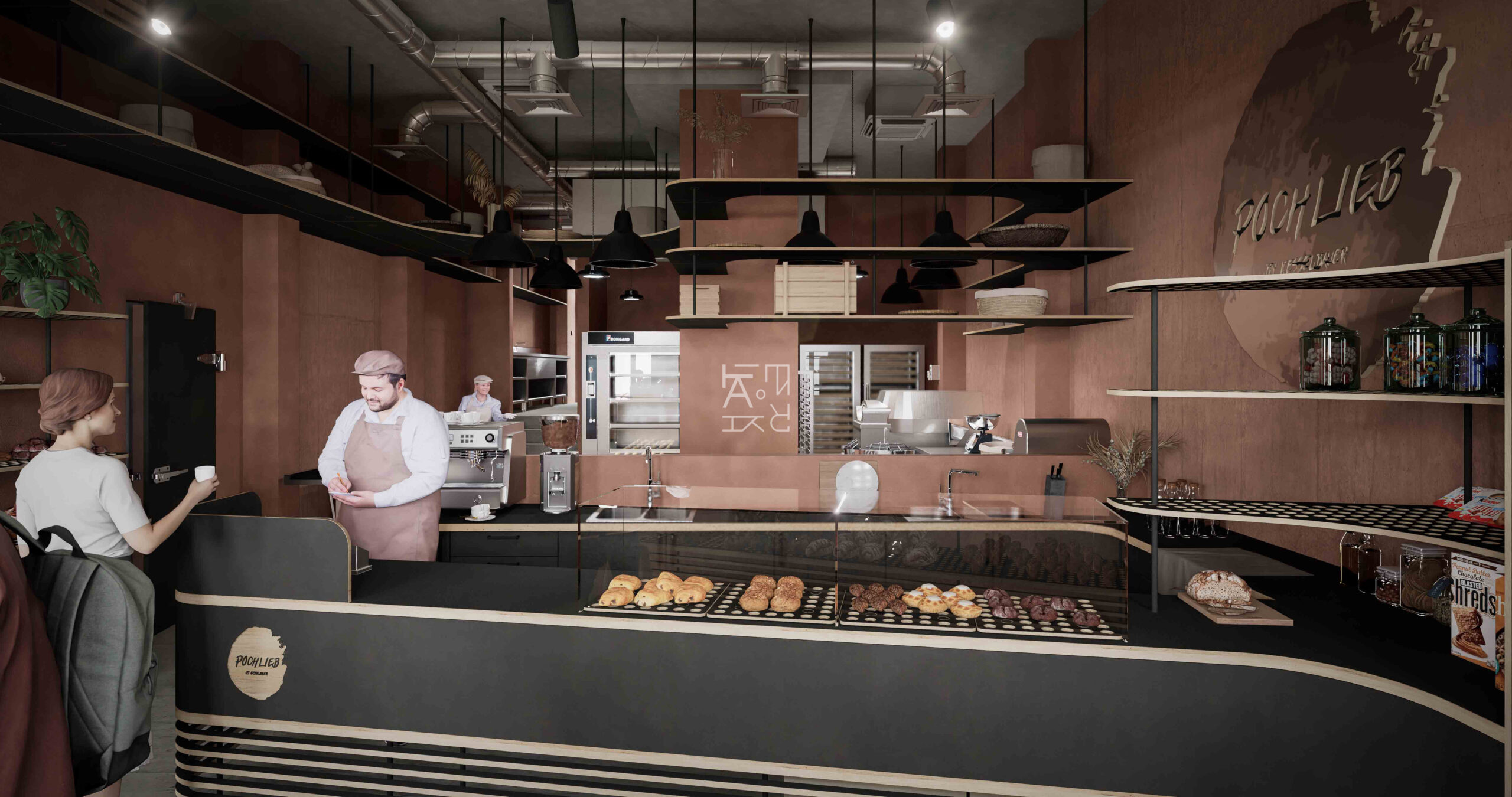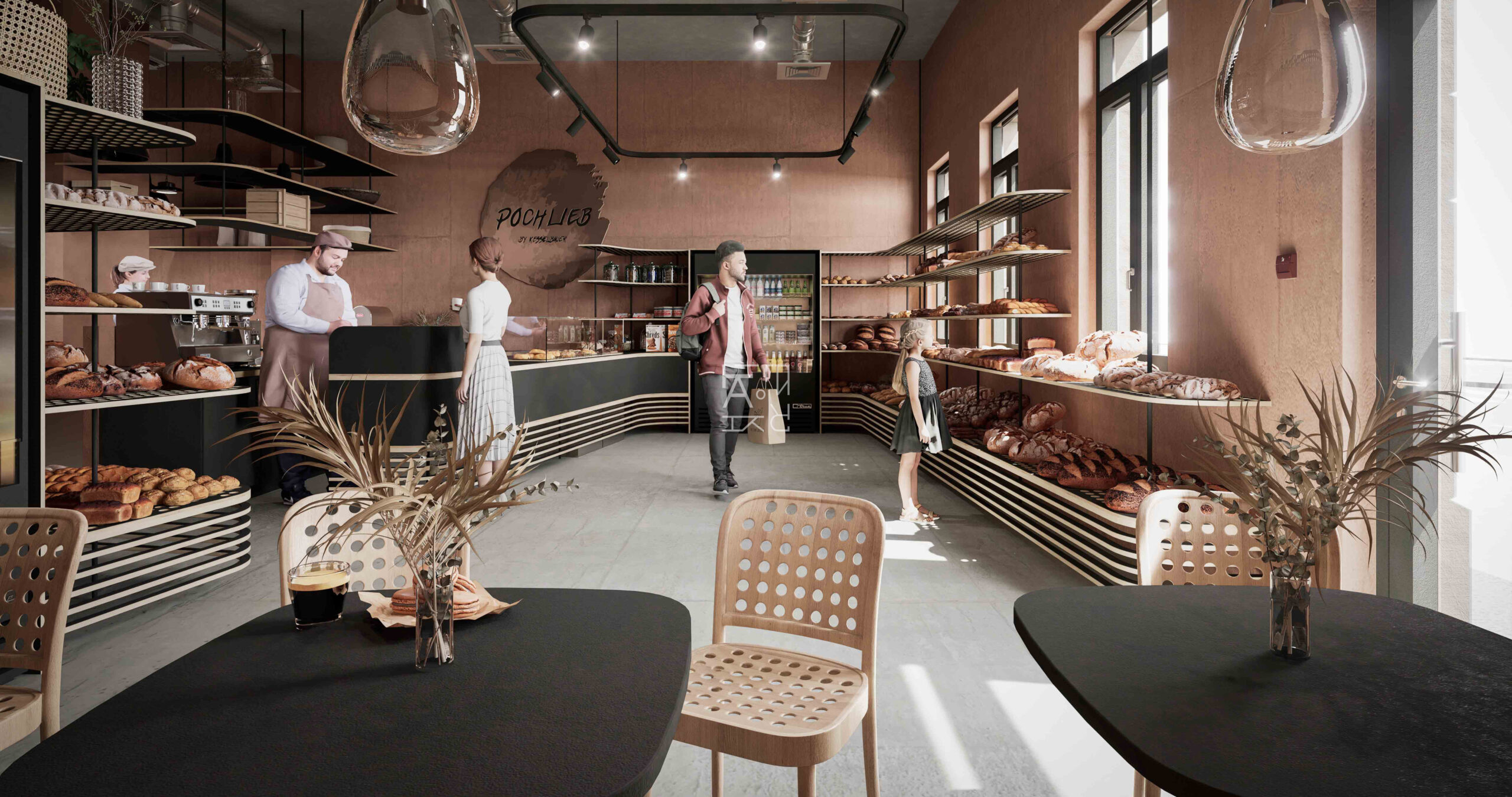 Za hlavnú myšlienku celého návrhu je dynamickú krivku, ktorá sa začína od samotného vstupu do pekárne a končí sa pri výklade do vnútrobloku. Jej súčasťou je sústava políc, regálov, predajného pultu a sedenia pre návštevníkov pekárne. Inšpiráciu sme čerpali zo spôsobu miesenia cesta, ktoré sa naťahuje a formuje pod rukami pekára.